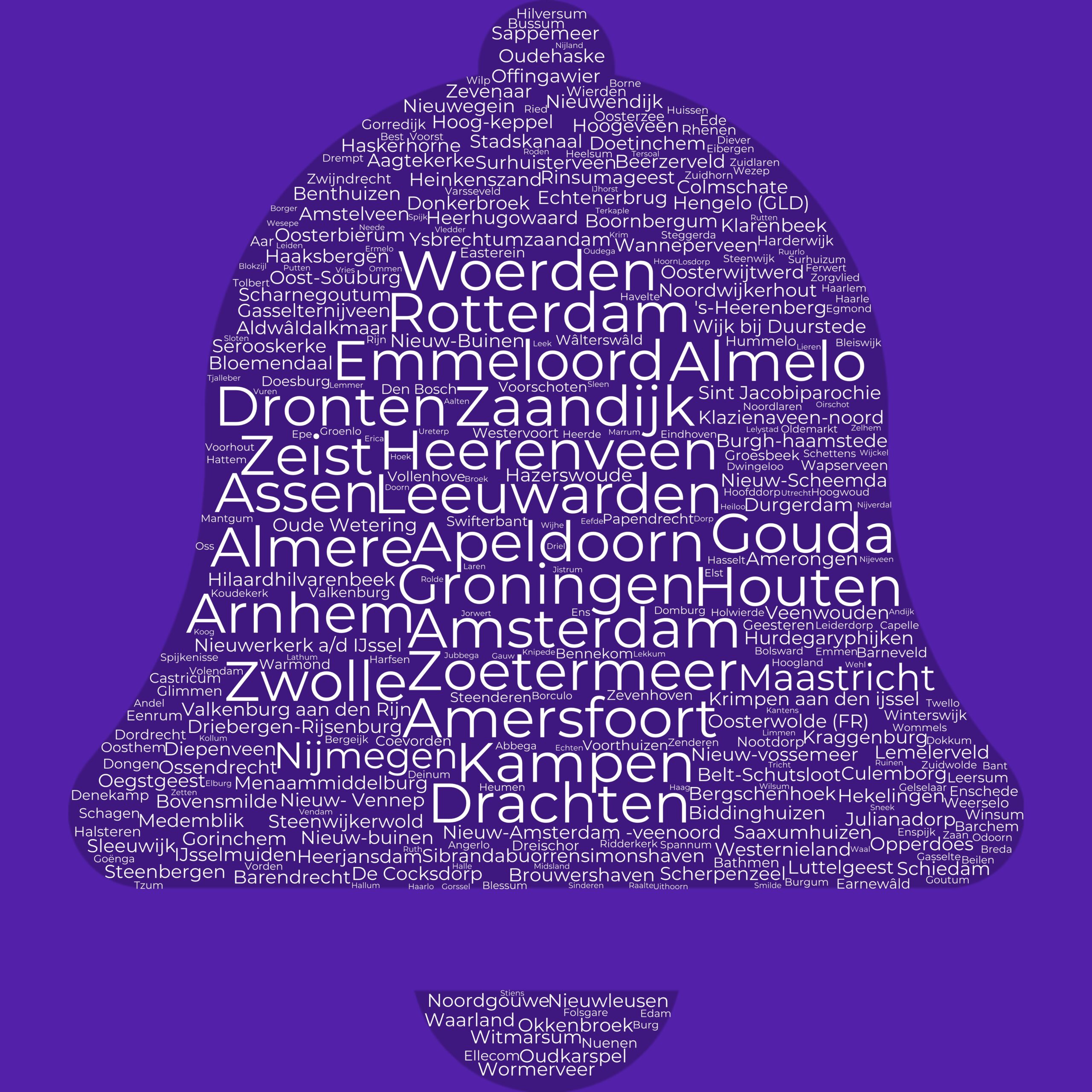 Aagtekerke, Aalten, Abbega, Aldwâld, Alkmaar, Almelo, Almere, Almere-Haven, Amerongen, Amersfoort, Amsterdam, Andijk, Apeldoorn, Arnhem, Assen, Barchem, Barendrecht, Bathmen, Bant, Barneveld, Beerzerveld, Beilen, Bennekom, Benthuizen, Bergschenhoek, Bergeijk, Best, Biddinghuizen, Bleiswijk, Blokzijl, Bloemendaal, Boornbergum, Borculo, Borger, Borne, Bovensmilde, Breda, Broek, Brouwershaven, Burgum, Burgh Haamstede, Burgh-Haamstede, Bussum, Capelle aan den IJssel, Castricum, Coevorden, Colmschate, Culemborg, De Cocksdorp, De Knipe, De Koog, De Krim, De Waal, Den Andel, Den Bosch, Den Burg, Den Haag, Den Hoorn, Denekamp, Deinum, Diepenveen, Diever, Dokkum, Domburg, Donkerbroek, Doetinchem, Doorn, Dordrecht, Drachten, Drempt, Dreischor, Driebergen-Rijsenburg, Driel, Dronten, Dwingeloo, Earnewâld, Easterein, Echtenerbrug, Echten, Ede, Edam, Eefde, Egmond aan Zee, Eibergen, Eindhoven, Elburg, Ellecom, Elst, Emmeloord, Emmen, Ens, Enschede, Enspijk, Erica, Ermelo, Etten-Leur, Ferwert, Folsgare, Gasselte, Gasselternijveen, Gauw, Geesteren, Gelselaar, Glimmen, Goënga, Gorinchem, Gorredijk, Gorssel, Gouda, Groenlo, Groningen, Groesbeek, Haaksbergen, Haarlem, Haarlo, Hallum, Halle, Halsteren, Harderwijk, Harfsen, Haskerhorne, Hattem, Havelte, Hazerswoude Dorp, Heelsum, Heerde, Heerenveen, Heerhugowaard, Heerjansdam, Heiloo, Heinkenszand, Hekelingen, Hengelo (Gld), Hilvarenbeek, Hilaard, Hilversum, Hoek, Hoofddorp, Hoogeveen, Hoog-Keppel, Hoogland, Hoogwoud, Holwierde, Houten, Huissen, Hummelo, Hurdegaryp, IJhorst, IJsselmuiden, Jistrum, Jorwerd, Jubbega, Julianadorp, Kampen, Kantens, Klazienaveen-Noord, Koog aan de Zaan, Koudekerk aan den Rijn, Kraggenburg, Krimpen aan den IJssel, Krimpen aan de Lek, Laren, Lathum, Leek, Leeuwarden, Leersum, Leiderdorp, Lekkum, Lelystad, Lemelerveld, Lemmer, Leiden, Limmen, Lieren, Lith, Losdorp, Luttelgeest, Maastricht, Mantgum, Marrum, Medemblik, Menaam, Middelburg, Midsland, Neede, Nieuw Amsterdam-Veenoord, Nieuw-Buinen, Nieuwendijk, Nieuwleusen, Nieuw-Vossemeer, Nijeveen, Nijland, Nijverdal, Noordgouwe, Noordlaren, Noordwijkerhout, Nootdorp, Nuenen, Odoorn, Oegstgeest, Offingawier, Okkenbroek, Oldemarkt, Oirschot, Ommen, Oosterbierum, Oosterwolde (Fr), Oosterwijtwerd, Oosterzee, Oosthem, Oost-Souburg, Opperdoes, Oss, Oudehaske, Oudega (Swf), Oude Wetering, Oudkarspel, Papendrecht, Putten, Raalte, Ridderkerk, Rhenen, Rinsumageest, Roden, Rolde, Rotterdam, Ruurlo, Rutten, Saaxumhuizen, Sappemeer, Schagen, Scharnegoutum, Scherpenzeel, Schettens, Schiedam, Sibrandabuorren, Simonshaven, Sinderen, Sint Jacobiparochie, Sleeuwijk, Sleen, Sloten, Smilde, Sneek, Spannum, Spijkenisse, Spijk (Gn), Steenderen, Steenbergen, Steenwijk, Steenwijkerwold, Steggerda, Stadskanaal, Stiens, Surhuisterveen, Surhuizum, Swifterbant, Serooskerke, Ter Aar, Terkaple, Tersoal, Tjalleberd, Tolbert, Tricht, Twello, Tzum, Uithoorn, Ureterp, Utrecht, Valkenburg (Zh), Valkenburg aan den Rijn, Varsseveld, Veendam, Veenwouden, Vledder, Vollenhove, Volendam, Voorschoten, Voorhout, Voorthuizen, Vorden, Vries, Vuren, Wanneperveen, Wapserveen, Waarland, Weerselo, Wehl, Wesepe, Westervoort, Westerbork, Westernieland, Wierden, Wijckel, Wijk bij Duurstede, Wijhe, Wilsum, Witmarsum, Winsum, Winterswijk, Wommels, Woerden, Wormerveer, Ysbrechtum, Zaandijk, Zaandam, Zeist, Zelhem, Zenderen, Zetten, Zevenaar, Zevenhoven, Zoetermeer, Zorgvlied, Zuidhorn, Zuidlaren, Zuidwolde, Zwolle en Zwijndrecht.