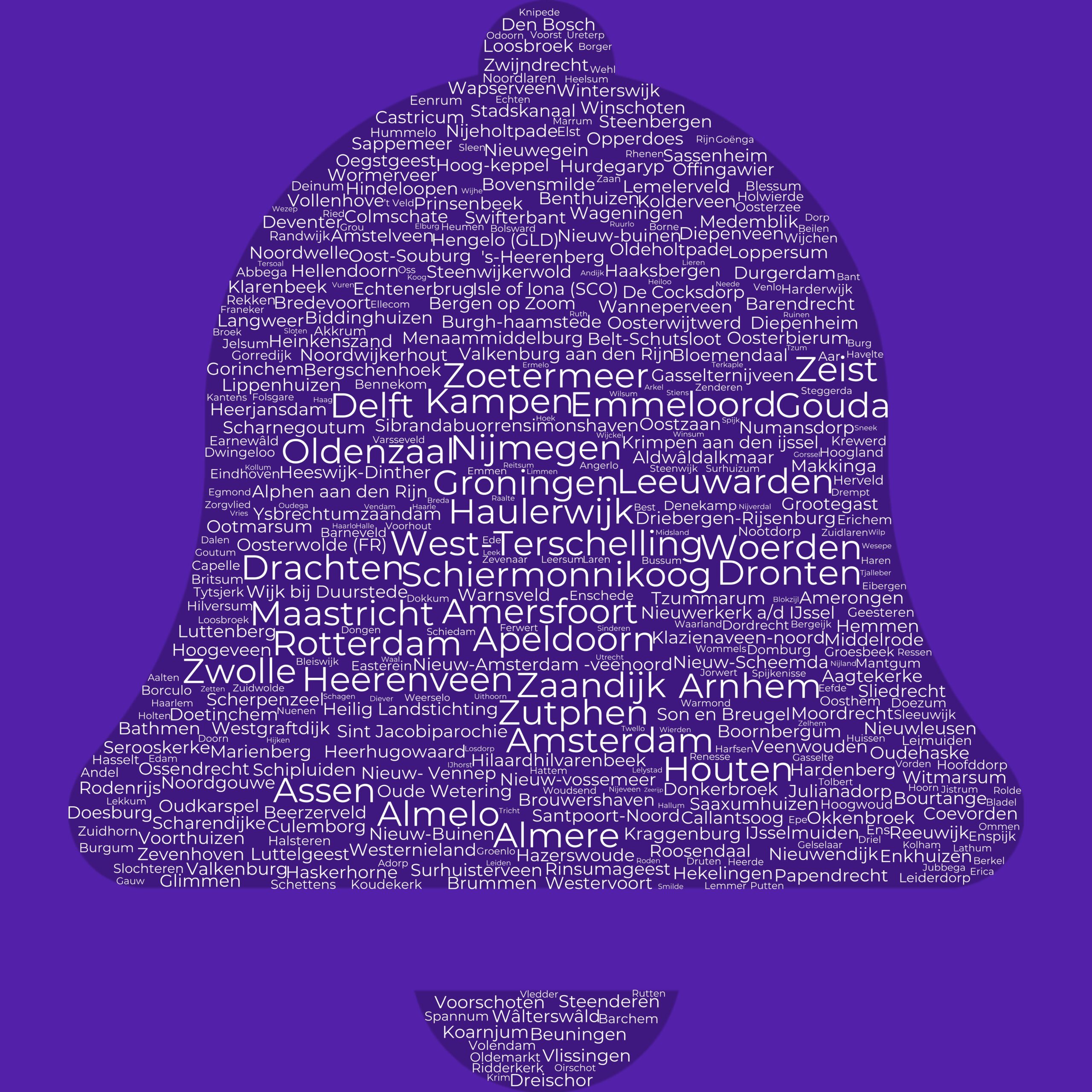 Aagtekerke, Aalten, Abbega, Aldwâld, Alkmaar, Almelo, Almere, Amersfoort, Amerongen, Amsterdam, Amstelveen, Andijk, Angerlo, Apeldoorn, Arnhem, Assen, Bant, Barchem, Barendrecht, Barneveld, Bathmen, Beerzerveld, Beilen, Belt-Schutsloot, Bennekom, Benthuizen, Bergeijk, Bergschenhoek, Best, Biddinghuizen, Blessum, Bleiswijk, Blokzijl, Bloemendaal, Boornbergum, Borculo, Borger, Borne, Bolsward, Bovensmilde, Breda, Broek, Brouwershaven, Burgum, Burgh-Haamstede, Bussum, Capelle aan den IJssel, Castricum, Coevorden, Colmschate, Culemborg, De Cocksdorp, De Knipe, De Koog, De Krim, De Waal, Deinum, Den Andel, Den Bosch, Den Burg, Den Haag, Den Hoorn, Denekamp, Diepenveen, Diever, Dokkum, Domburg, Donkerbroek, Dongen, Doetinchem, Doorn, Dordrecht, Doesburg, Drachten, Dreischor, Driebergen-Rijsenburg, Drempt, Driel, Dronten, Durgerdam, Dwingeloo, Earnewâld, Easterein, Echtenerbrug, Echten, Ede, Edam, Eefde, Egmond aan Zee, Eibergen, Ellecom, Elburg, Elst, Emmeloord, Emmen, Ens, Enschede, Enspijk, Eenrum, Epe, Erica, Ermelo, Etten-Leur, Ferwert, Folsgare, Gasselte, Gasselternijveen, Gauw, Geesteren, Gelselaar, Glimmen, Goënga, Gorinchem, Gorredijk, Gorssel, Gouda, Goutum, Groenlo, Groningen, Groesbeek, Haaksbergen, Haarlem, Haarle, Haarlo, Hallum, Halle, Harderwijk, Harfsen, Haskerhorne, Hasselt, Hattem, Havelte, Hazerswoude Dorp, Heelsum, Heerde, Heerenveen, Heerhugowaard, Heerjansdam, Heiloo, Heinkenszand, Hekelingen, Hengelo (Gld), Heumen, Hilaard, Hilvarenbeek, Hilversum, Hoek, Hoofddorp, Hoog-Keppel, Hoogland, Hoogeveen, Hoogwoud, Holwierde, Houten, Hummelo, Huissen, Hurdegaryp, Hijken, IJhorst, IJsselmuiden, Jistrum, Jorwert, Jubbega, Julianadorp, Kampen, Kantens, Klazienaveen-Noord, Klarenbeek, Kollum, Koog aan de Zaan, Koudekerk aan den Rijn, Kraggenburg, Krimpen aan de Lek, Krimpen aan den IJssel, Laren, Lathum, Leek, Leeuwarden, Leersum, Leiderdorp, Leiden, Lekkum, Lelystad, Lemelerveld, Lemmer, Limmen, Losdorp, Luttelgeest, Maastricht, Mantgum, Marrum, Medemblik, Menaam, Middelburg, Midsland, Neede, Nieuw Amsterdam-Veenoord, Nieuw-Buinen, Nieuw-Vennep, Nieuw-Vossemeer, Nieuwendijk, Nieuwegein, Nieuwleusen, Nijland, Nijeveen, Nijmegen, Nijverdal, Noordgouwe, Noordlaren, Noordwijkerhout, Nootdorp, Odoorn, Oegstgeest, Offingawier, Oirschot, Okkenbroek, Oldemarkt, Ommen, Oost-Souburg, Oosthem, Oosterbierum, Oosterwijtwerd, Oosterwolde (FR), Oosterzee, Opperdoes, Oss, Ossendrecht, Oude Wetering, Oudehaske, Oudega (SWF), Oudkarspel, Papendrecht, Putten, Raalte, Rhenen, Ridderkerk, Ried, Rinsumageest, Roden, Rolde, Rotterdam, Ruinen, Ruurlo, Rutten, Saaxumhuizen, Sappemeer, Schagen, Scharnegoutum, Scherpenzeel, Schettens, Schiedam, Simonshaven, Sinderen, Sint Jacobiparochie, Sleen, Sleeuwijk, Sloten, Smilde, Sneek, Spannum, Spijk (GN), Spijkenisse, Stadskanaal, Steenderen, Steenbergen, Steenwijk, Steenwijkerwold, Steggerda, Stiens, Surhuisterveen, Surhuizum, Swifterbant, Ter Aar, Terkaple, Tersoal, Tjalleber, Tolbert, Tricht, Twello, Tzum, Uithoorn, Ureterp, Utrecht, Valkenburg (ZH), Valkenburg aan den Rijn, Varsseveld, Veendam, Veenwouden, Vledder, Vollenhove, Volendam, Voorschoten, Voorhout, Voorst, Voorthuizen, Vorden, Vries, Vuren, Wâlterswâld, Wanneperveen, Wapserveen, Warmond, Waarland, Weerselo, Wehl, Wezep, Wesepe, Westervoort, Westernieland, Wierden, Wijk bij Duurstede, Wijckel, Wijhe, Wilp, Wilsum, Winterswijk, Winsum, Witmarsum, Wommels, Woerden, Wormerveer, Ysbrechtum, Zaandam, Zaandijk, Zelhem, Zenderen, Zetten, Zevenaar, Zevenhoven, Zeist, Zoetermeer, Zorgvlied, Zuidhorn, Zuidlaren, Zuidwolde, Zwolle, Zwijndrecht.