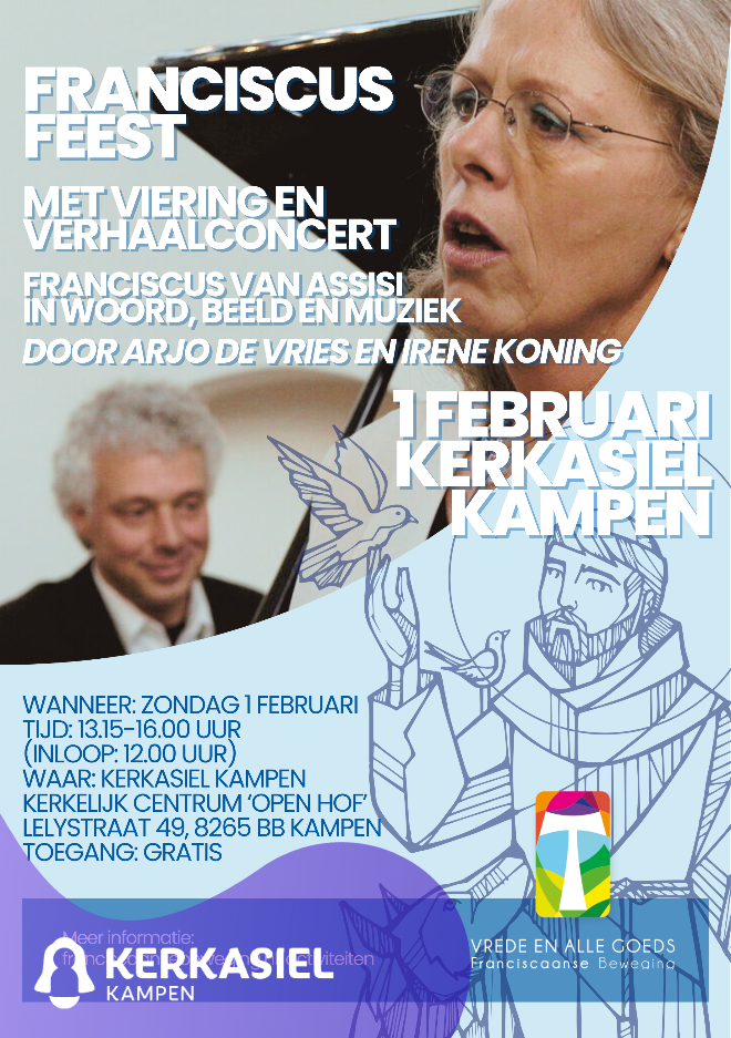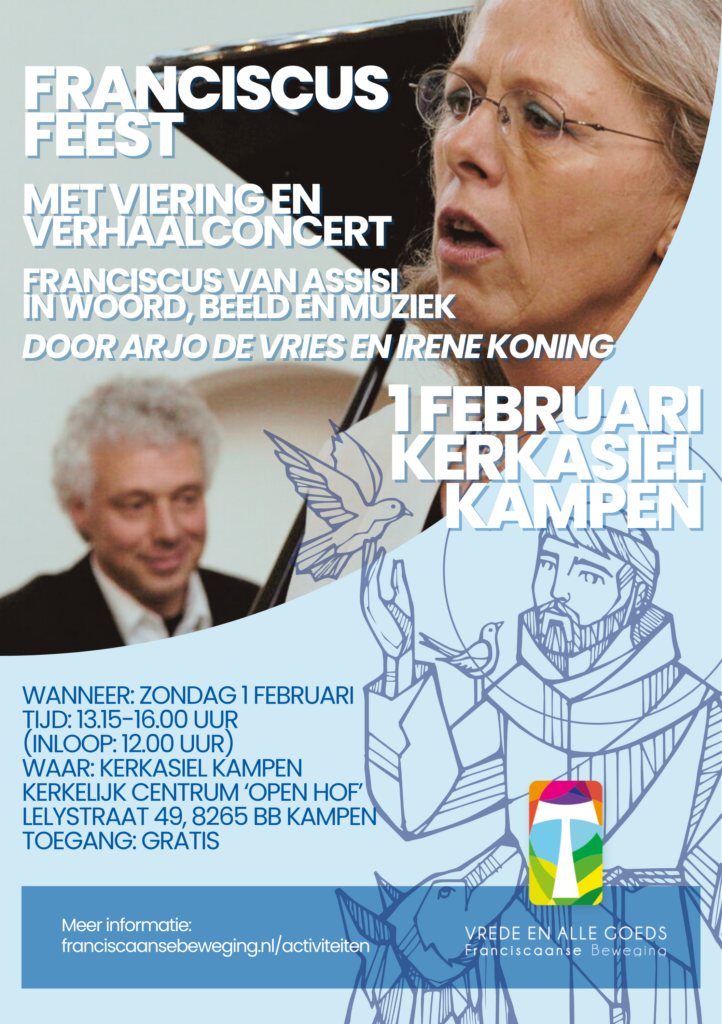 “Op zondagmiddag 1 februari vieren we het Franciscus feest. Met voorgangers van diverse Franciscaanse groepen, samen het Zonnelied zingen en gesprekken over o.a. de boodschappen van Paus Franciscus en Paus Leo voor vluchtelingen. In de gebedsviering van 12.00-16.00 staat centraal het verhaalconcert over Franciscus 13:15 – 14:30 van Irene Koning en Arjo de Vries. Één tip van de sluier: het begint met een thema uit Peter en de wolf….”