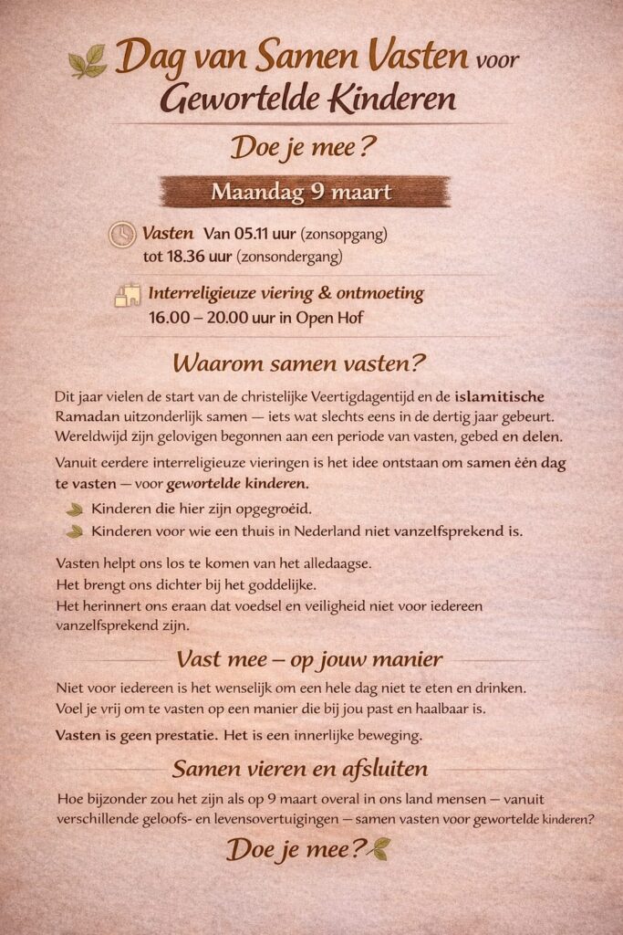 Op maandag 9 maart roepen we iedereen in Nederland op om samen te vasten voor gewortelde kinderen. Mensen uit verschillende geloofs- en levensovertuigingen worden uitgenodigd om zich die dag, van zonsopgang tot zonsondergang, in verbondenheid te onthouden van eten en drinken – of om te vasten op een manier die past bij de eigen gezondheid en mogelijkheden.